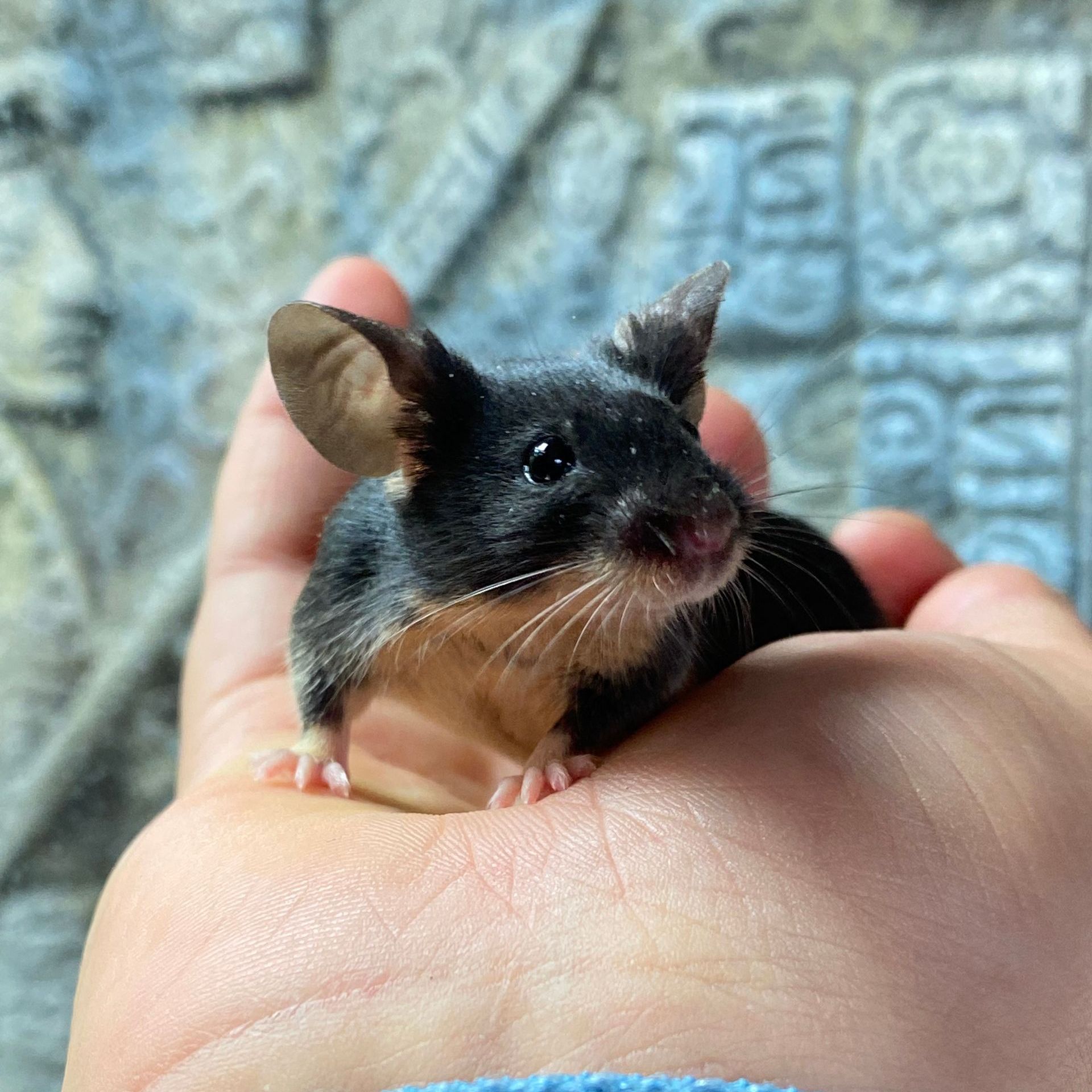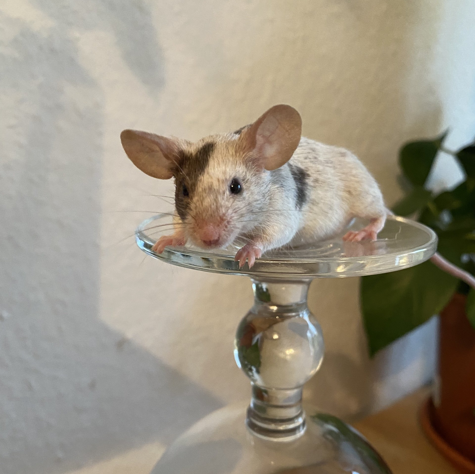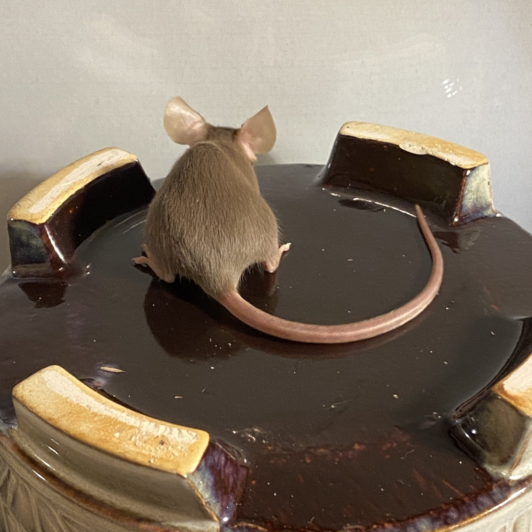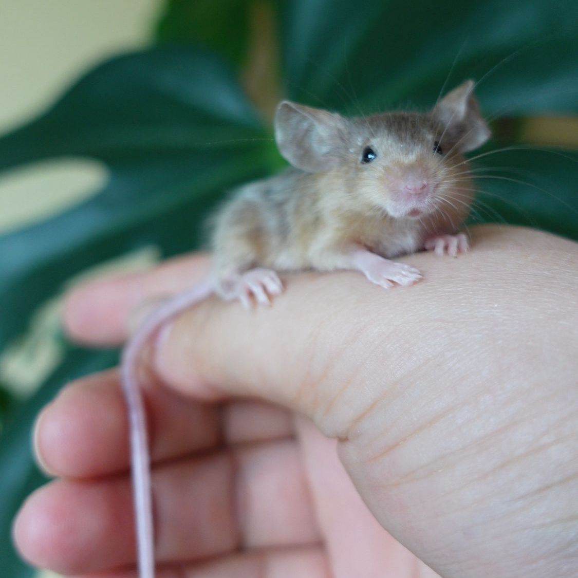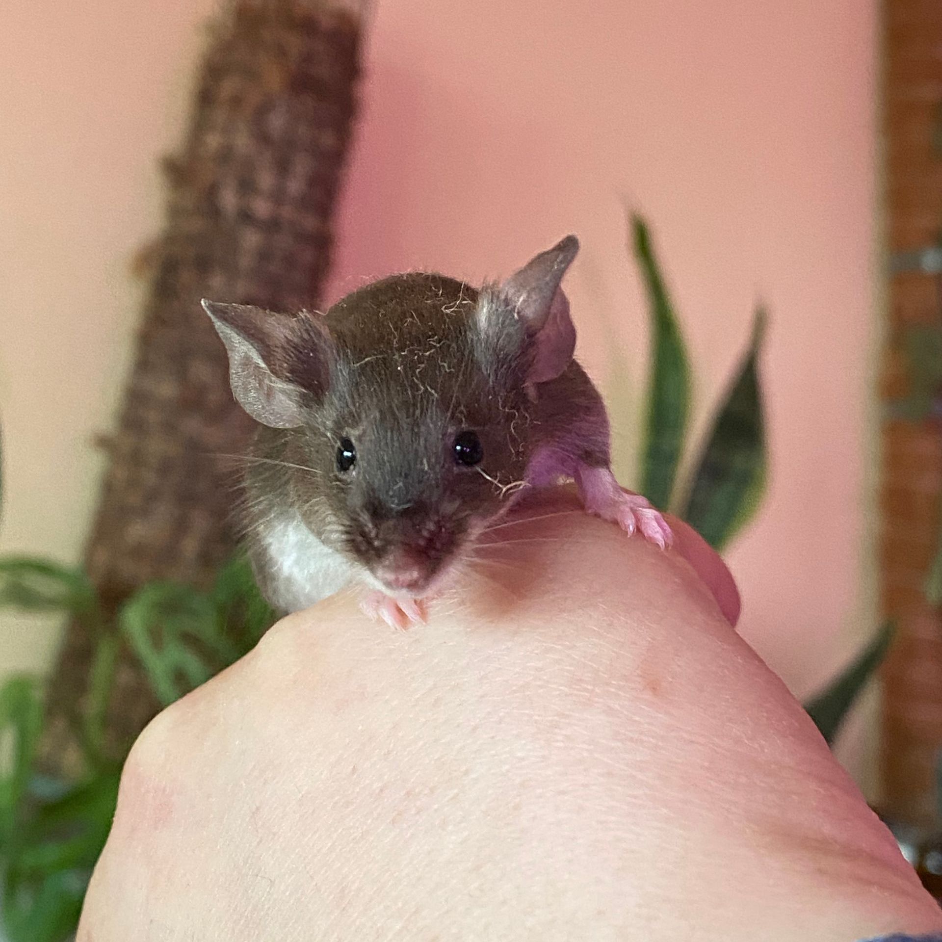 In Kombination mit splashed entsteht eine braune Maus mit Points und unregelmäßigen dunklen Flecken im Fell.